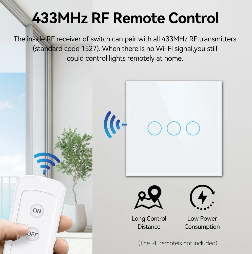 The inside RF receiver of switch can pair with all 433MHz RF transmitters(standard code 1527). When there is no Wi-Fi signal,you still could control lights remotely at home.