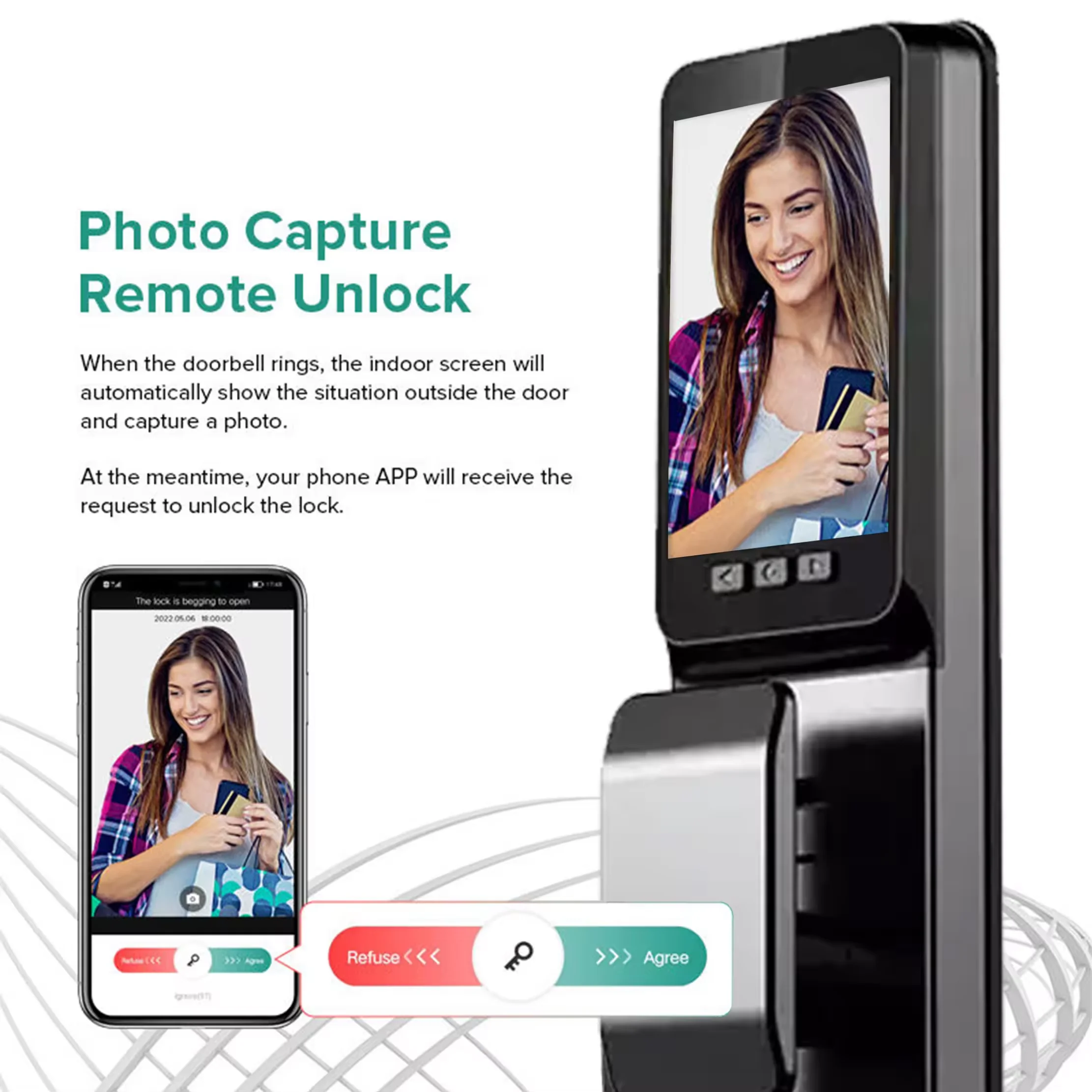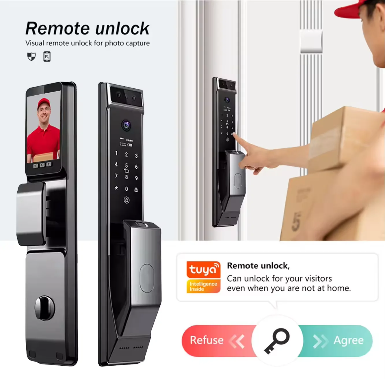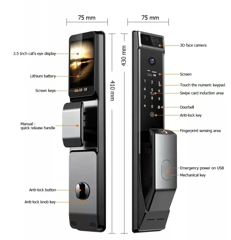 3D Face Recognition, Built-in Camera, Built-in Doorbell, Built-in Screen, NIGHT VISION, Tamper Alarm,WIFI, usmart go app or Tuya app